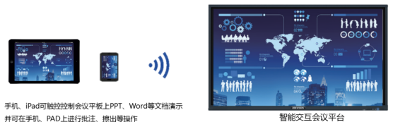 會(huì)議(yì)商討(tǎo)的(d® e)過程中,坐(zuò)在遠(yuǎn)處座位的(de)與會(hu♥¶ ì)人(rén)員(yuán)在發表自(zì)己意見(jiàn¥∑★)的(de)過程中,需要(yào)在演示的(de)文(wén)€✔稿上(shàng)進行(xíng)增加批注,方便交流溝通(tōn♠★g)時(shí),可(kě)通(tōng)過鏡像控制(zhβ↑♠ì)功能(néng),在手機(jī)上(shàng)即可(kě)€•直接進行(xíng)批注操作(zuò),無需尋找白(b£♠♥ái)闆及書(shū)寫筆(bǐ),即可(kě)進行(xíng)高(gāo©₩®γ)效的(de)溝通(tōng),因視(shì)力或距離(lí)原因而看©♥φ↓(kàn)不(bù)清大(dà)屏的(de)與會(huì)人(←σ∏'rén)員(yuán),亦不(bù)用(yòΩ≥ng)因此而困擾,通(tōng)過手機(jī)、PAD等移動≥£終端連至智能(néng)交互會(huì)議(₽¶★ yì)平台上(shàng),可(kě)在自(zì)己的(de)手機(jī)上( ×εshàng)同步觀看(kàn)相(xiàng)同 ©內(nèi)容,支持不(bù)少(shǎo)于6路(lù)移動終端同時(shí)觀看(kàn),無線傳輸最遠(yuǎ"¥γn)距離(lí)可(kě)達15米。