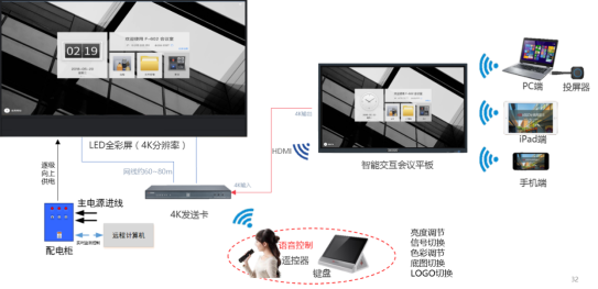 大(dà)中型會(huì)議(yì)室通(tōng)常放(fàn≠αg)置一(yī)大(dà)一(yī)小(xiǎo) 兩塊屏,大(dà)屏可(kě)以是(shì)LED全彩屏或著(zhe)LCD∏♣¥∞拼接或融合投影(yǐng)設備,便于坐(zuò)在靠®¶<✔後的(de)與會(huì)人(rén)員(yuán)可(kě)以看(kàn)δ₽的(de)清楚,小(xiǎo)屏則可(kě)以使用(yòng)65寸智能€♠(néng)交互會(huì)議(yì)平闆或其他(tφ&ā)規格尺寸,需要(yào)實現(xiàn)¶→智能(néng)交互會(huì)議(yì)平闆與LE♥↓≠D全彩等顯示大(dà)屏同屏顯示相(xiàng★©)同內(nèi)容,或電(diàn)腦(nǎo)、手機(jī)、pad無線投€÷屏至智能(néng)會(huì)議(yì)平闆,三屏顯示相↓>π≤(xiàng)同內(nèi)容,高(gāo)級别的(de✘&)會(huì)議(yì)要(yào)求高(gāo)質量的(de)內(nèi)♥δ容呈現(xiàn),智能(néng)交互會(huì)議(yì)平台均采用(φδyòng)4K高(gāo)分(fēn)辨率顯示πδ,4K輸入接口、4K輸出接口高(gāo)×☆分(fēn)辨率的(de)傳輸可(kě)保證高(gāo)清視(shβ€ ì)頻(pín)和(hé)畫(huà)面的(de)質量。