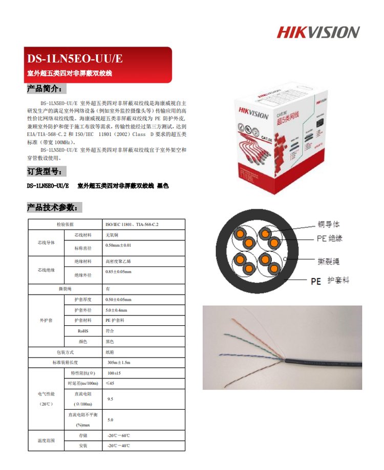 海(hǎi)康威視(shì) DS-1LN5EO-UU/E超五類網線0Ωφ.5非屏蔽雙絞線305米/箱